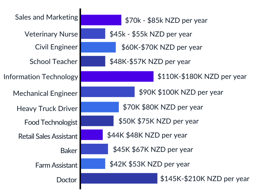 El salario mínimo actualmente se encuentra en $23.50 NZD (por hora), sin embargo, contando con un trabajo calificado puedes tener salarios entre los $30 – $35 NZD (por hora).